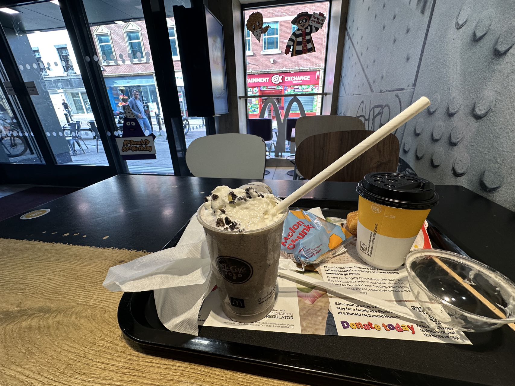 现在我每天早上都会去麦当当吃早餐,点相同的食物,然后顺便坐着读会儿书。英国清晨来往的行人并不多,令我关注更多的是早上拂煦的阳光,扫过那条石子路带着鹅卵的温润又扑向麦当劳的26号小桌。